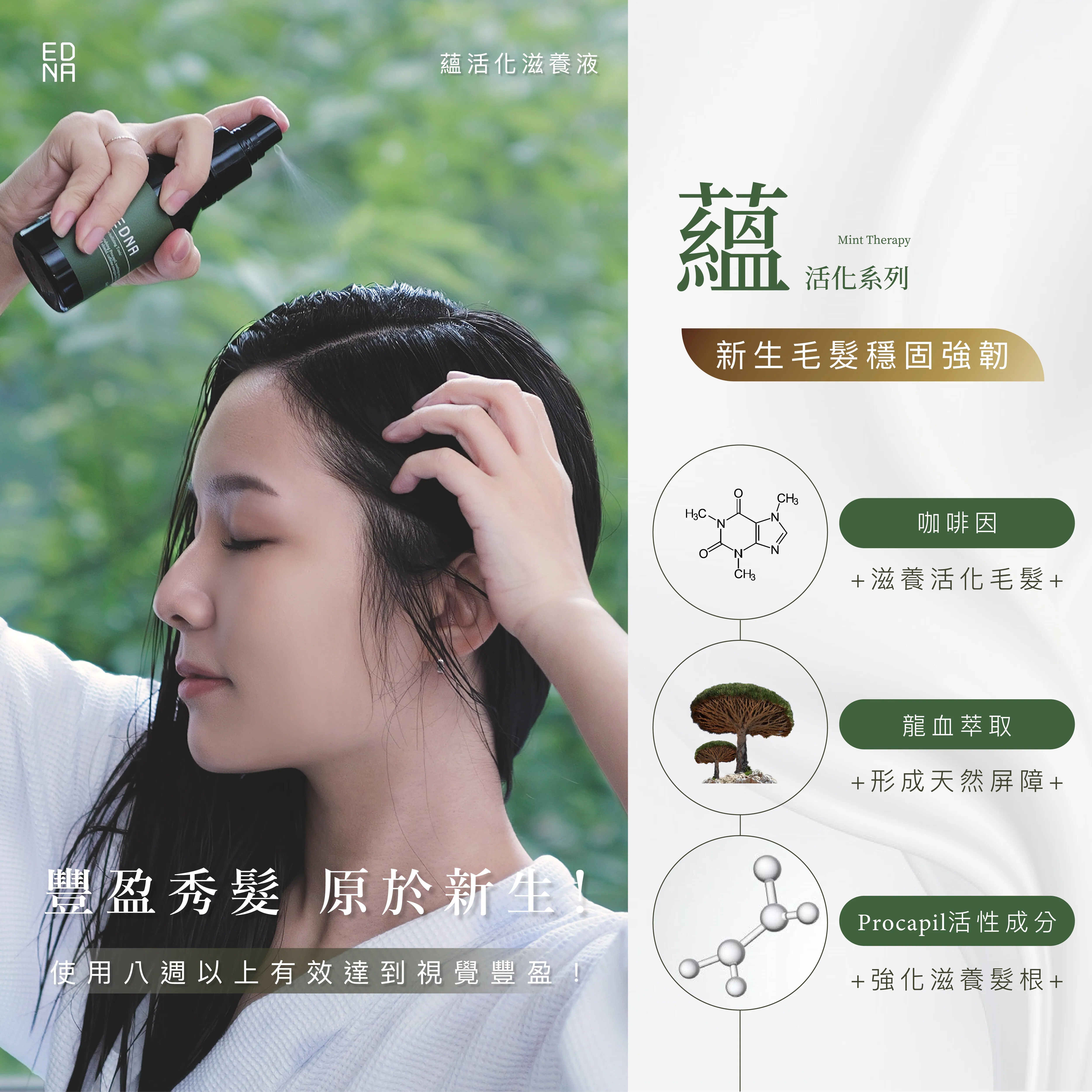 Procapil和日本專利BURGEON-UP,雙效護理強化毛髮根源不易斷,同時添加四合一抗敏植物萃取與COSMOS認證龍血,咖啡因萃專注活化與滋養,每日使用全面提升毛髮健康豐盈。