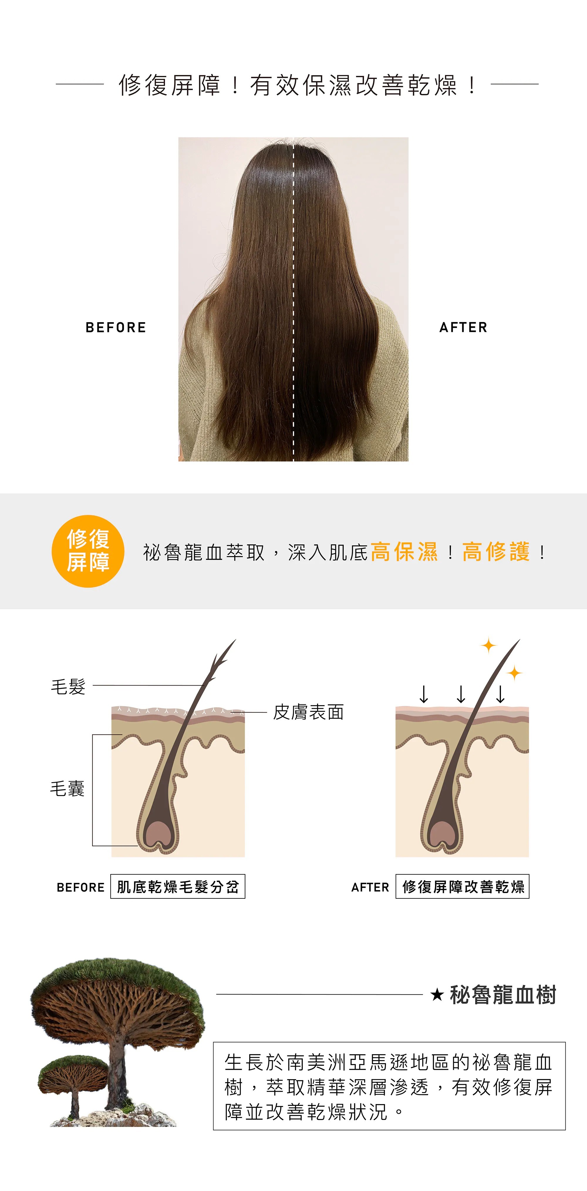 秘魯龍血萃取修復屏障,改善乾燥;天然認證鼠尾草籽萃取,預防化學損傷破壞頭髮的蛋白鏈結,合成仿生角質層有主助持髮質;有機蠟菊萃取液深層滋養秀髮,恢復毛囊活力。使髮絲水潤強韌不易斷裂。